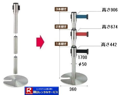 ●岡山でのベルトイン・パーティーションのレンタル料金・レンタル価格 ●サイズ:φ350ベース×H860 ベルト長さ:L2000 ●ベルト色:ブルー・レッド ●レンタル料金→¥3,000/2泊3日まで/1本(税別) ●センター取寄せ商品につき取寄・返却運賃(別途)が必要です。