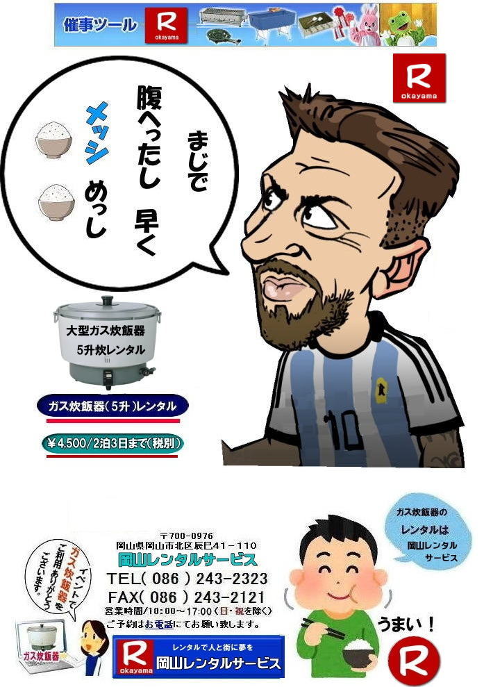 ●プロパンガス仕様 サイズ:W500×D500×H450 重量 :13,2s 炊飯能力:3.6〜10L(20〜55合) ●5升炊飯のレンタル ●美味しく炊けるので、食べ過ぎに注意!しましょう。 ●レンタル料金:¥4,500/2泊3日まで(税別)