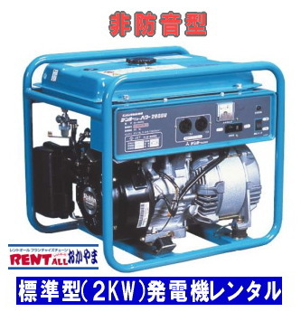 ●2KW発電機・レンタル(標準型発電機レンタル) ●サイズ:W550×D450×H541 ●重 量:40kg(タンク空時) ●地域によって型番が違います。 ●タンク容量→11リットル ●満タンで約7時間〜約8時間(目安) ●音はかなり、うるさいのでご覚悟を! ●レンタル料金→¥15,000/1日(税別)