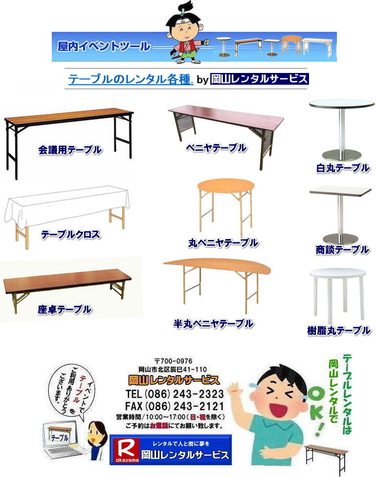 現場事務所や選挙事務所等で人気の什器・備品のレンタルです。TEL086-243-2323