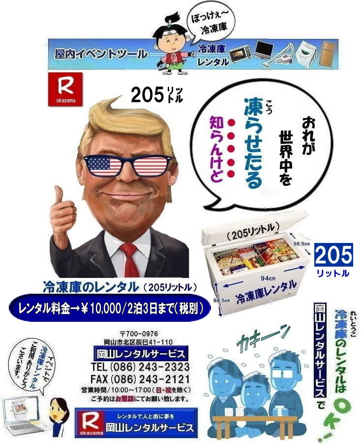 ◆岡山での冷凍庫レンタル ◆冷凍庫(102リットル)レンタル・フリーザーレンタル/岡山レンタルサービス ◆内容積 :102L ◆消費電力:100V・113W ◆展示会・学園祭での定番商品! ◆ご予約はお早めにお願いいたします。 ◆レンタル料金→¥5,000/2泊3日まで(税別)