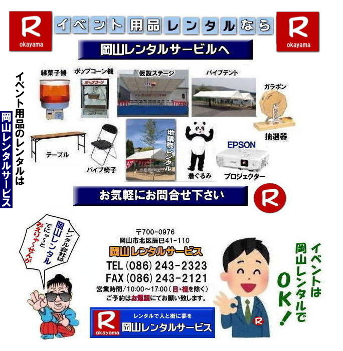 岡山|イベント用機材|レンタル|テントレンタル|テーブルレンタル|椅子|ステージレンタル|音響機器レンタル|模擬店用品レンタル|抽選機|地鎮祭用品|レンタル料金|岡山