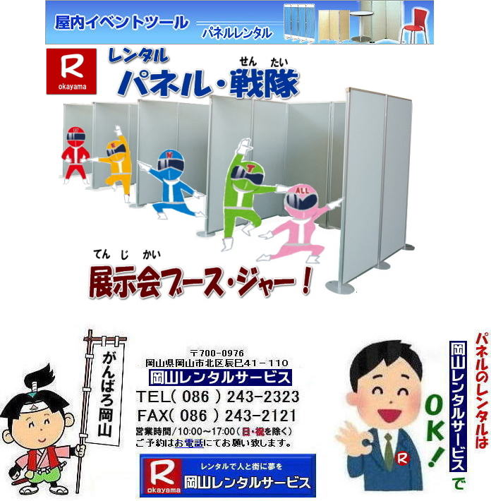 ![]() ![]() ![]() 同意の上でレンタルをご利用下さい。(約款をクリック) お客様各位|レンタルご利用の際はレンタル約款を必ずご確認の上お申込みお願い致します 岡山|パネルレンタル|パネル設営|撤収|ヴァンテアンパネルレンタル|岡山でのパネルのレンタルは岡山レンタルサービスへ|お気軽にご相談下さい|TEL086-243-2323![]() 岡山での|テーブル|テント|椅子|事務用備品|家電レンタル|パネルレンタル|選挙用品|仮設トイレ|仮設ハウス|運動会用品|地鎮祭|冷暖房機器|レンタル|岡山レンタルサービスへご相談下さい|TEL086-243-2323