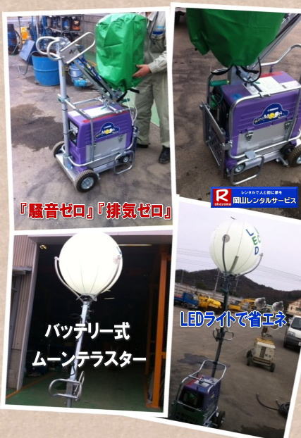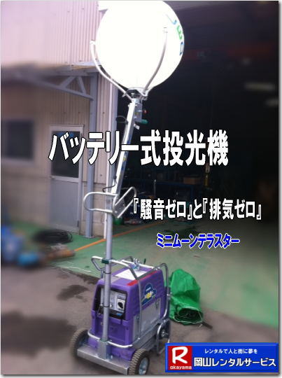 ※バッテリー式 ●ミニムーンテラスターのレンタル料金 ●LED ●燃料:バッテリー ●満充電で約8,5時間連続点灯 ●総重量:約60s ●レンタル料金→¥20,000/1日(税別) ●搬入・搬出にはユニック車が別途必要です(別料金)
