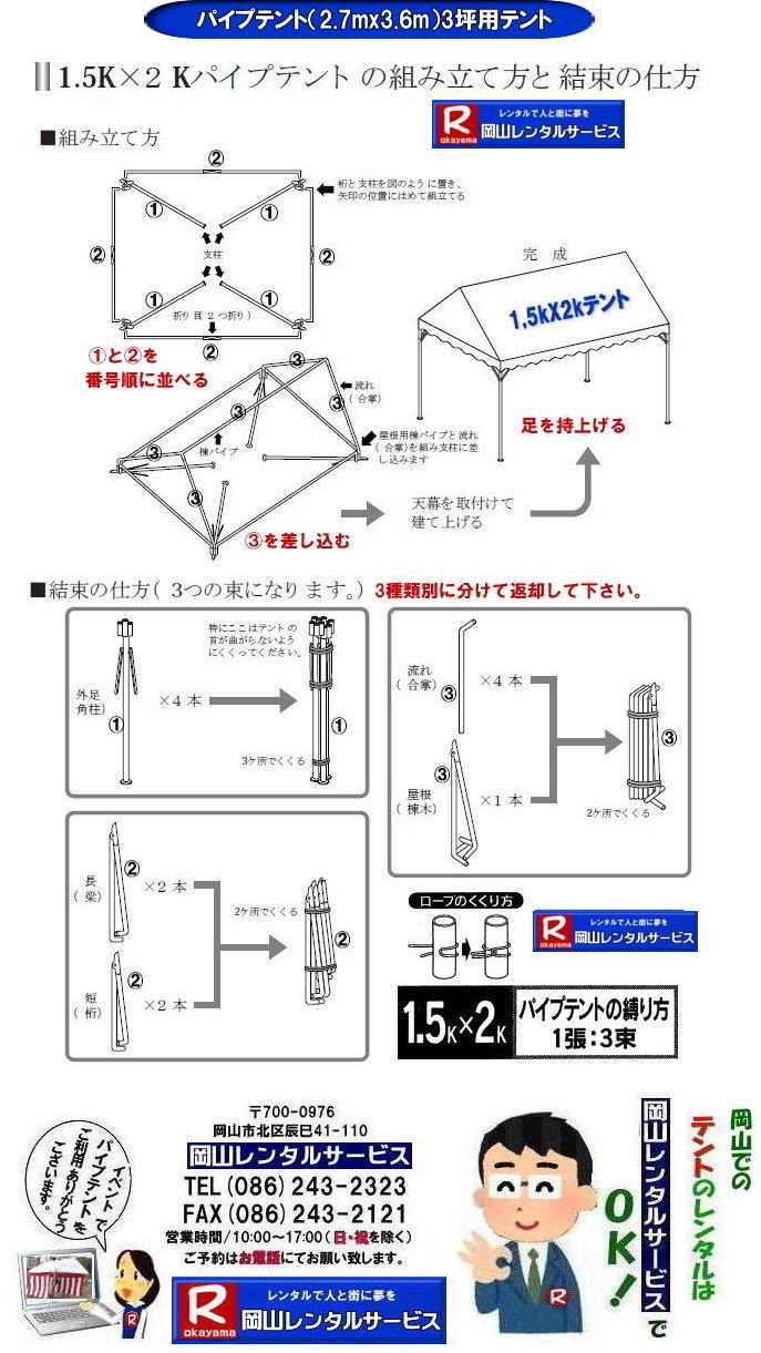 | ●岡山でのテントのレンタルは(1,5KX2K)岡山レンタルサービスへ|TEL086-243-2323| ●サイズ:2,7mX3,6m(3坪) ●レンタル料金→¥5,000/2泊3日(税別) ●レンタル料金→¥5,500/2泊3日(税込み) ●地鎮祭等(式典)以外の場合は天幕のクリーニング代が別途必要です。 ●テントのウエイトは別途料金が必要です ●テントの設営・撤収費用は別途見積りとなります。 |