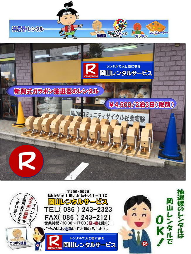 | ●抽選器レンタルの名称 ●抽選でガラガラ回す物の名称は? ●抽選器・ガラガラ・ガラポン・・・と呼ばれています。 ●正式名は・・・新井式回転抽選器・・・らしいです。 ●ガラガラ抽選器は、年代を問わず来場者皆様がお楽しみになれる商品です ●楽しい福引抽選器のレンタルで集客もUP!まさに笑顔のレンタル! ●抽選器があれば、盛り上がり、まちがいない!当たりでリンを鳴らせばさらに盛り上り! ●※抽選器をご使用する際は、ハンドルを早く回すと抽選球が出にくくなります ●回すのは・・・ゆっくりと回して下さい。 ●レントオール岡山在庫は(EP-026大とEP-024小)です。 ●レンタル料金EP-024(小)→¥4,000/2泊3日まで(税別) ●レンタル料金EP-026(大)→¥4,500/2泊3日まで(税別) |